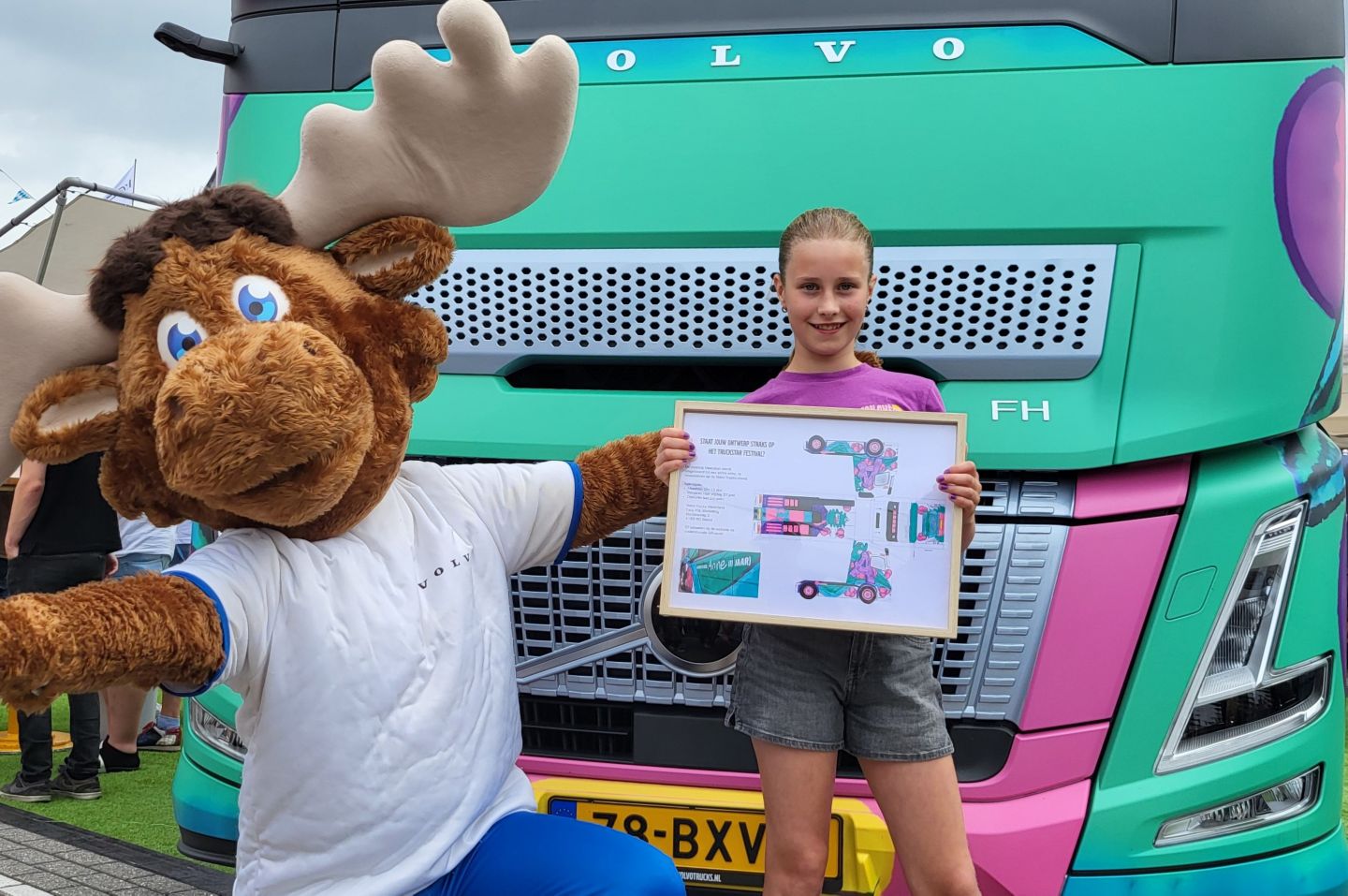 De oorspronkleijke zilvergrijze kleur van de truck is afgelopen zomer aangepast naar het opvallende ontwerp van de 11-jarige Anne. De leerlinge uit groep 8 won de ontwerpwedstrijd van Volvo Trucks. Het maakte het recente bezoek van Dennis aan haar school dan ook net wat specialer: “Het is echt bijzonder om ‘m nu hier bij mijn school te zien staan”, zei Anne enthousiast.