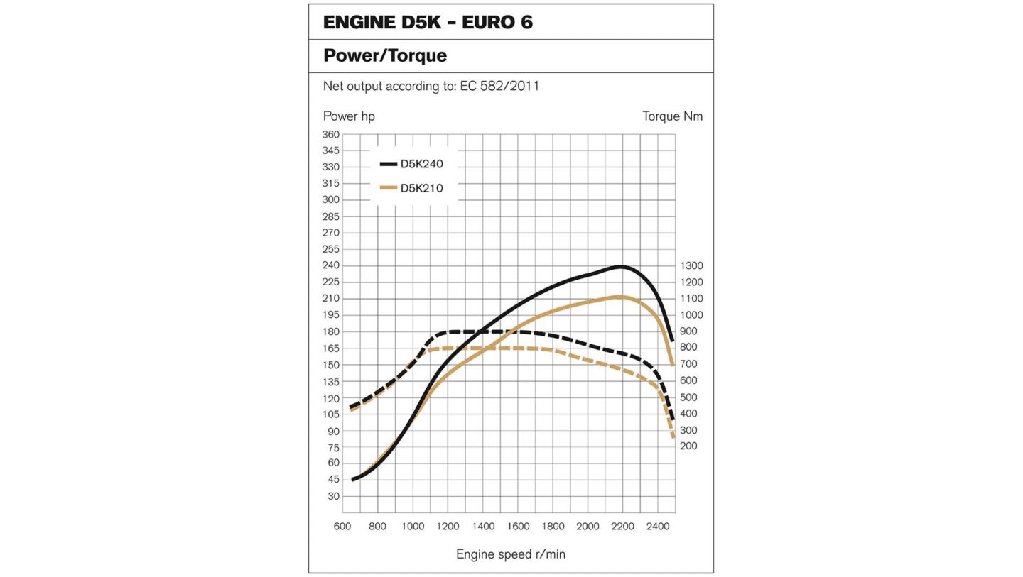De 5-liter grote 4-cilinder motor van Volvo voldoet aan de Euro 6-normen en is leverbaar met 240 pk/900 Nm en 210 pk/800 Nm. De soepel lopende motor heeft zijn maximale koppel al beschikbaar bij een laag toerental. Dit staat garant voor een gunstig brandstofverbruik en een laag geluidsniveau. Beide krachtbronnen worden nu verkrijgbaar in een groter aantal Volvo FL-modellen, waaronder die van 14 en 16-ton. Aangezien de motor en transmissie samen 200 kg minder wegen dan de 6-cilindermotor (eveneens Euro 6) komt er evenveel extra laadvermogen vrij.
