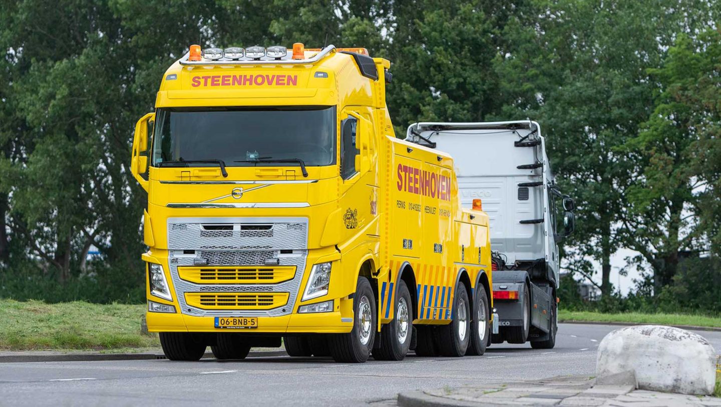 “Deze truck zetten we in om in opdracht van Rijkswaterstaat trucks, bussen en touringcars te bergen”, vertelt mede-eigenaar Henk van der Steenhoven. “Daarnaast zorgen we in opdracht van bijvoorbeeld transportbedrijven en dealers, waaronder Volvo Group Truck Center, voor transport van voertuigen die in het buitenland zijn gestrand. Dat doen we in een straal van zo’n 500 kilometer rond Rotterdam, al komen we ook wel eens in Zuid-Frankrijk en Spanje. Indien gewenst, nemen we een vervangende truck mee zodat de chauffeur verder kan en halen we de defecte truck terug naar Nederland.”