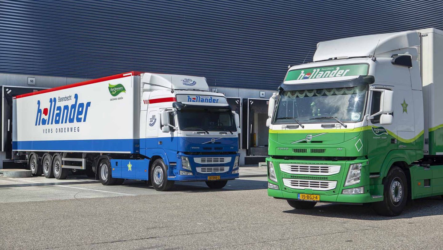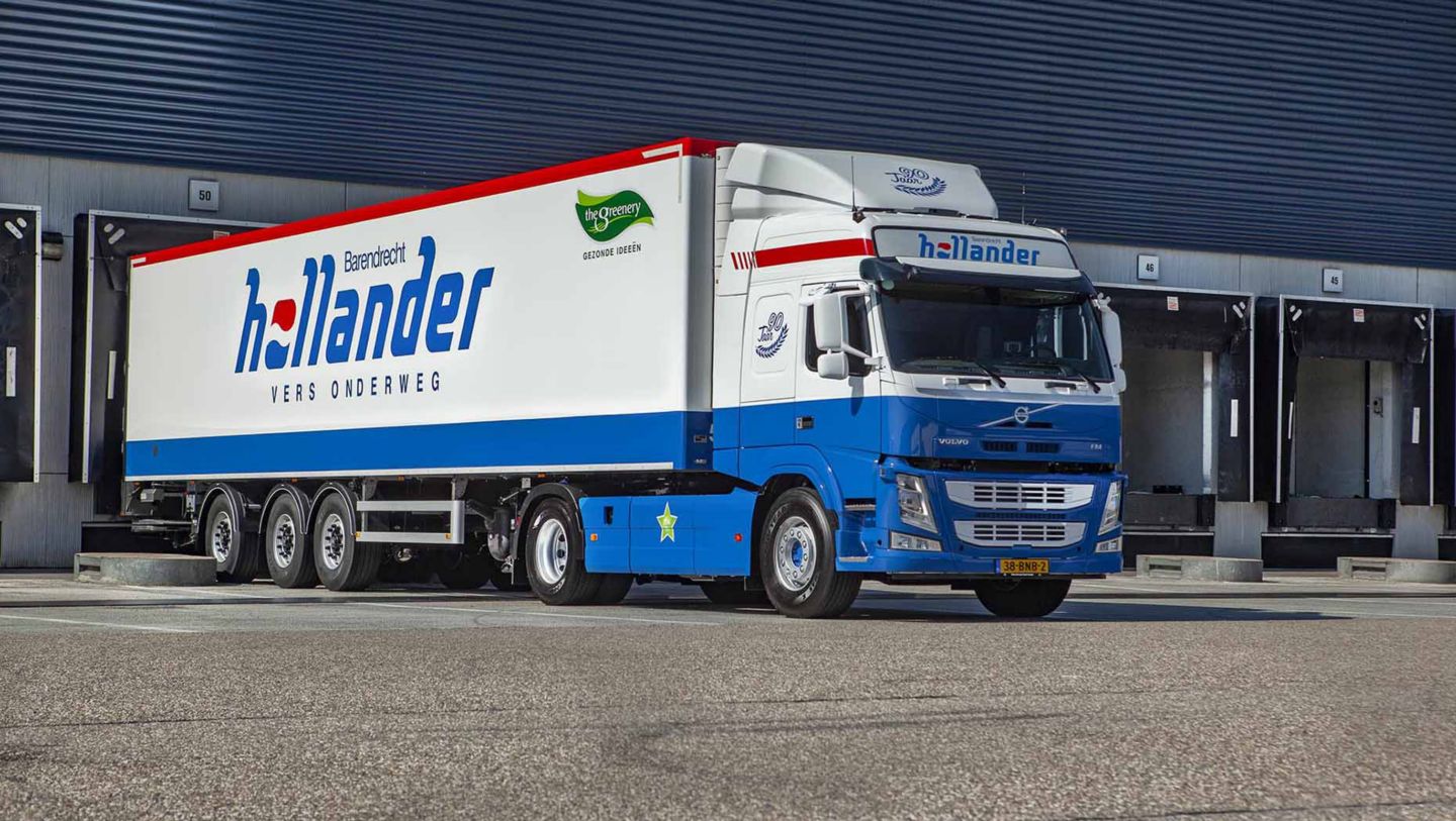 Voor het distributiewerk worden onder meer dertien nieuwe Volvo FM 420 4x2-trekkers met Globetrotter-cabine ingezet, deels uitbreiding en deels vervanging van de vloot. Eén daarvan is gespoten in speciale kleurstelling, in de traditionele kleuren van Hollander, en voorzien van een logo. “Dat was een verrassing voor alle collega’s omdat we dit jaar ons negentigjarig bestaan vieren”, zegt Van Est.