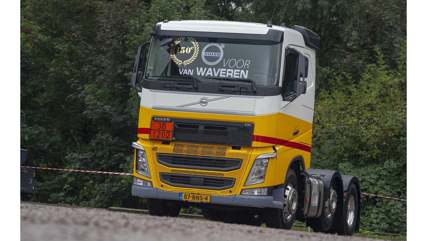 De Volvo FH 6x2-trekker met een gestuurde voorloopas is gespoten in de kleurstelling van opdrachtgever Shell, waarvoor Van Waveren Transport sinds de jaren ’70 actief is. Het partnership met Volvo bestaat al net zolang. “In 1975 hebben we de eerste Volvo-truck in gebruik genomen en nu dus de 150e”, vertelt Van Waveren. “Er zijn tal van redenen voor de langdurige samenwerking. Allereerst delen we de focus op veiligheid. Wij zijn actief in ADR-transport en daarbij is veilig werken een topprioriteit. We hebben ons materieel daarom altijd voorzien van alle beschikbare veiligheidsopties, iets waarin Volvo Trucks uitblinkt.”