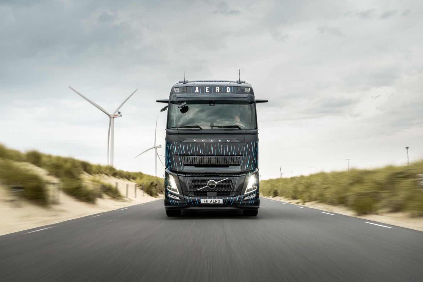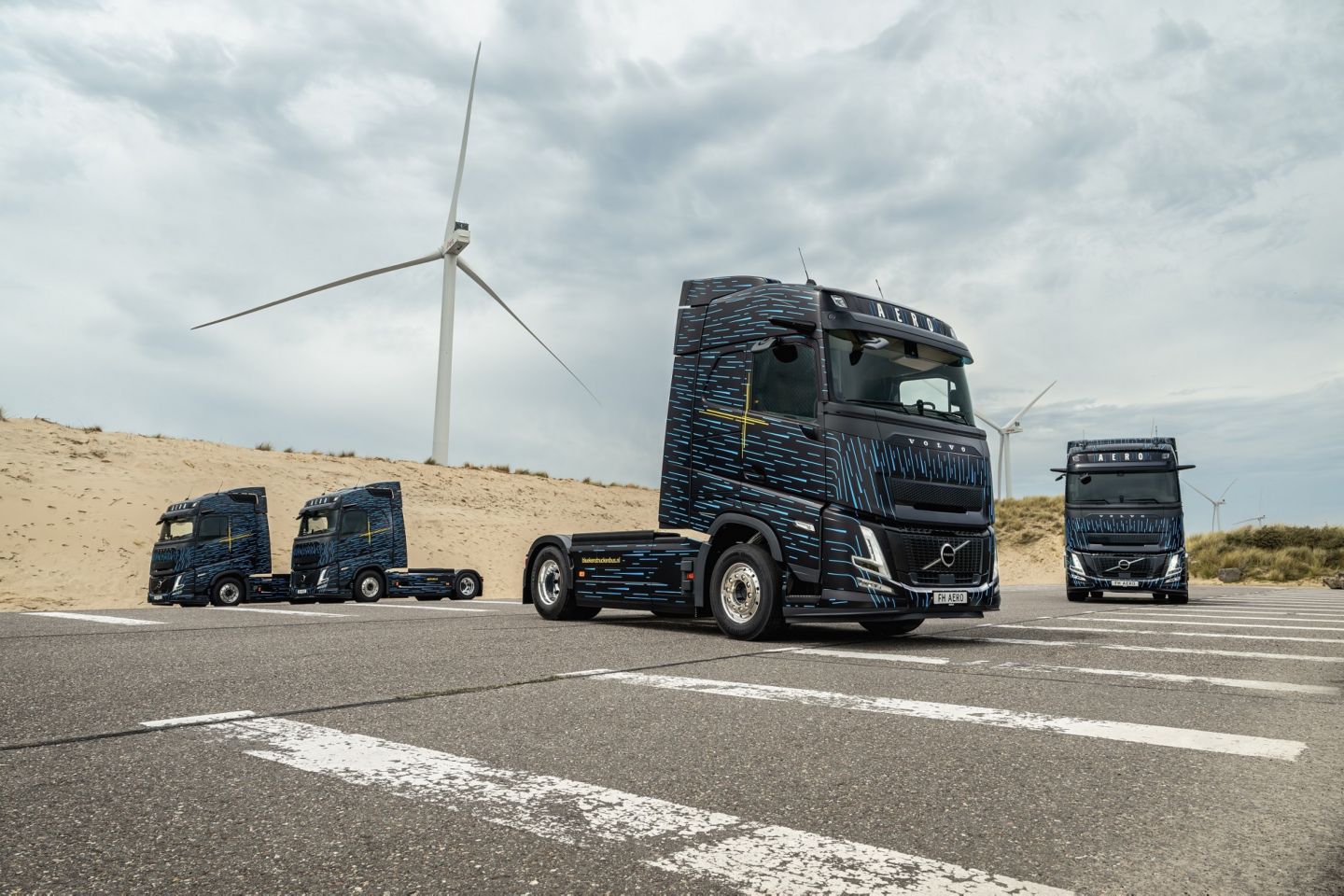 Na de introductie van de nieuwe Volvo FH Aero-range eerder dit jaar, is het nu mogelijk om de energie-efficiënte truck zelf te ervaren bij de Volvo Trucks-dealer. De vijftien demotrucks hebben een zwart-metallic Globetrotter-cabine als basis en zijn gewrapt in een bijzonder design. De blauwe striping, die eerder al te zien was op Volvo's SuperTruck 2, is geïnspireerd op de luchtstromen bij tests in de windtunnel. De lijnen benadrukken het aerodynamische design van de truck. Als finishing touch wordt op beide zijkanten met gele lijnen subtiel gehint naar de Zweedse vlag.