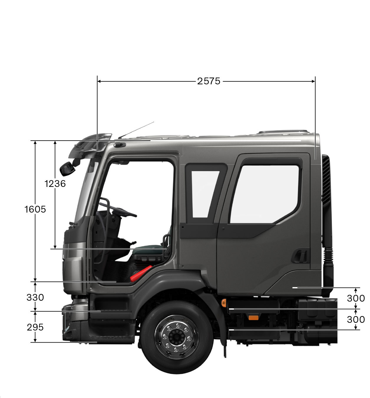 Crew cab (Manschappencabine) met voldoende ruimte voor meerdere extra passagiers tot 7 personen. Binnenhoogte 1605 mm.